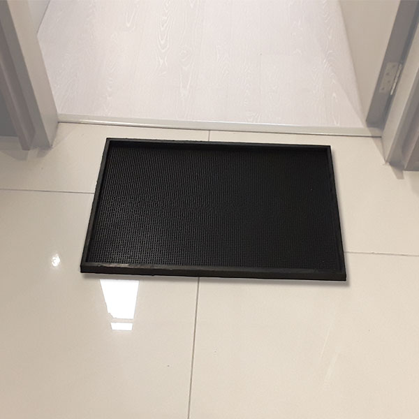 Tapete que limpia y desinfecta los zapatos. Para ser instalado en accesos a domicilios industriales, comerciales, particulares y otros.